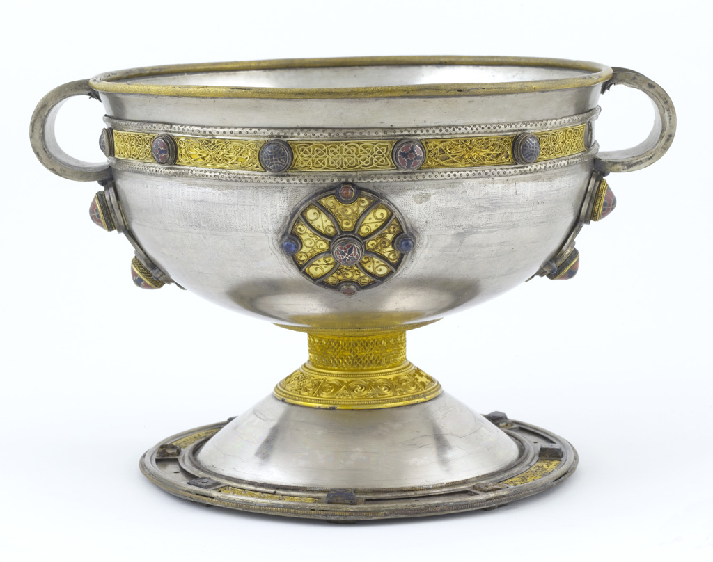 The Ardagh Chalice is one of the finest masterpieces of the Early Christian Church. It was found near Ardagh, Co Limerick in the 19th century by a boy digging potatoes. The Chalice dates to the 8th Century AD and it was used to hold wine during the mass ceremony. The shape of the Chalice was influenced by Roman tableware. The Chalice is composed of more than 250 seperate pieces – silver , gold, enamel, glass, amber and semi-precious stones.