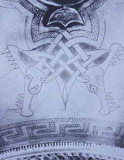 On the cup are two large roundels with cross shaped designs – back and front. Below the two handles there is animal decoration Incised into the silver bowl.