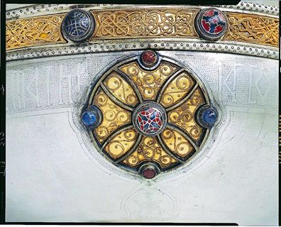 (A) The front is ornamented with a series of extremely fine gold filigree panels depicting animal and abstract motifs that are separated by studs of glass, enamel and amber. These panels of filigree were soldered into position. Several of the panels are now missing. The style of the decoration of ornate interlace that found in the Book of Kells.