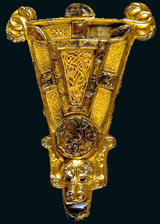 (C)The pin of the brooch is also highly decorated with gold filigree panels and studs. A large animal head adorns the point where the pin head meets the needle. This head is highly stylised and consists of spirals for the skull and the snout.