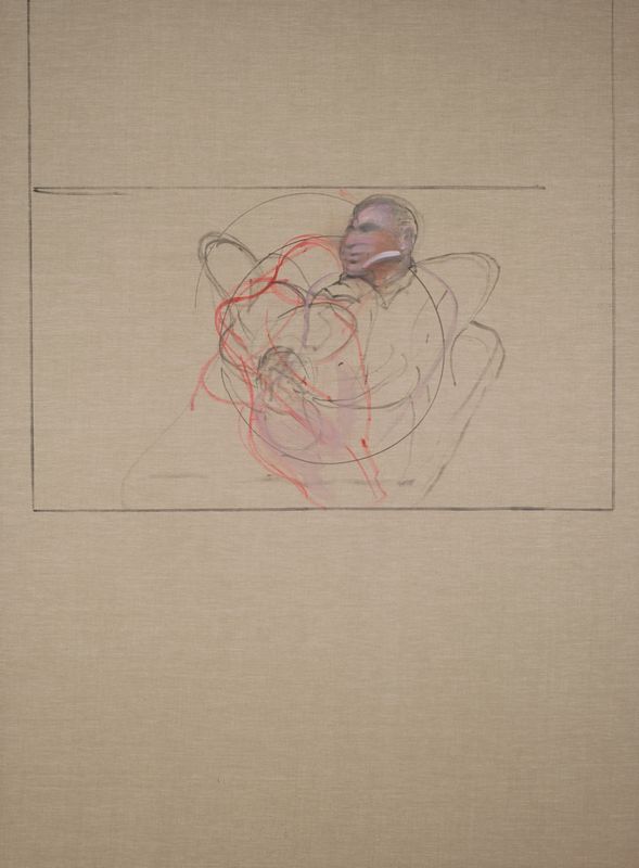 This unfinished self-portrait was found on Bacon’s easel in his Reece Mews studio on his death in April 1992. As is typical of Bacon’s procedure, the background has yet to be laid in. The head of the central figure is the most highly developed part of the canvas. It is unclear how many figures the artist intended to include in this composition. The circular outline may have been drawn using a dustbin lid, The vertical and horizontal lines framing the composition were probably made with a T-square.
