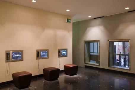 On entering the complex, it is quite dimly lit and this enables the film screen to be seen clearly. There is a small amount of overhead spotlights. As one approaches the actual studio and one looks at it through the glass it appears to be lit up. This effect is created by a overhead skylight and aswell as enabling us to see the studio more clearly it creates a shrine-like atmosphere to have the space lit up from the darkness of the AV room. The Micro Gallery is also quite dark which is good for viewing the multi-media screens. In this space there are two windows that look into the brighter Bacon Studio. As one enters the Chambers Gallery it becomes more brightly lit by spotlights making it easier to see at first hand the three paintings (uncompleted) by Francis Bacon.