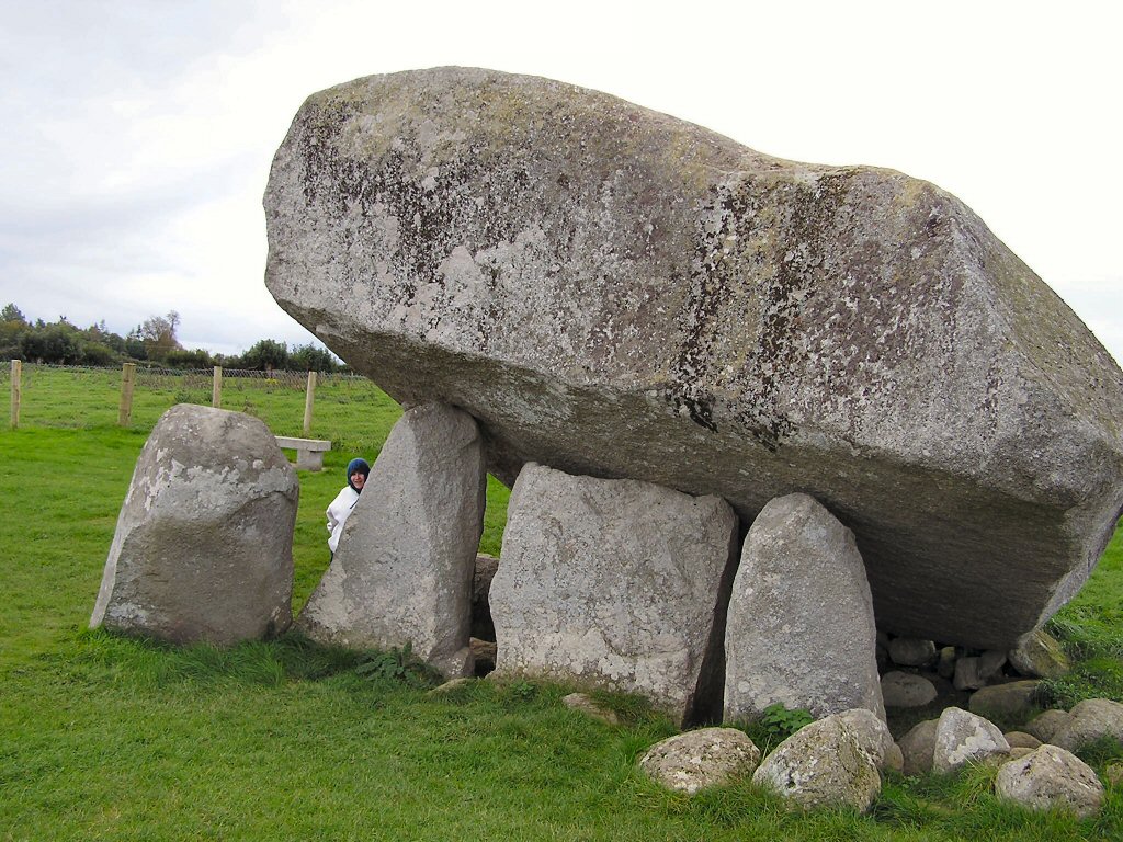A dolmen, also known as a portal tomb usually consists of two or more upright stones called Portal Stones supporting a large flat horizontal Capstone.This construction makes a tripod-shaped structure. In Ireland Dolmens date from as far back as 4000 BC. Cremated remains of the dead were placed inside the Dolmens and then covered over with a mound of small stones. This mound is called a Cairn. In most instances the Cairn has weathered away, leaving only the tripod stone structure of the burial mound intact.