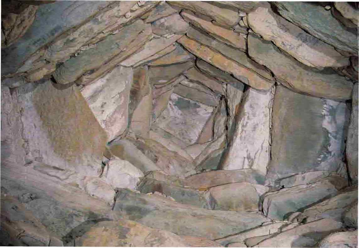 The Chamber is quite small but the roof of the chamber is very high- this is called a Corbelled Vault. The roof is built using a technique called corbelling. This involves stacking stones in such a way that they narrow gradually as the rise. A corbelled Vault was needed as it was strong enough to hold up the enormous weight of the cairn which presses down from overhead. The Chamber is cruciform in shape opening out into three recesses or side-chambers. Each side Chamber contains a basin stone which held the cremated remains of the dead.